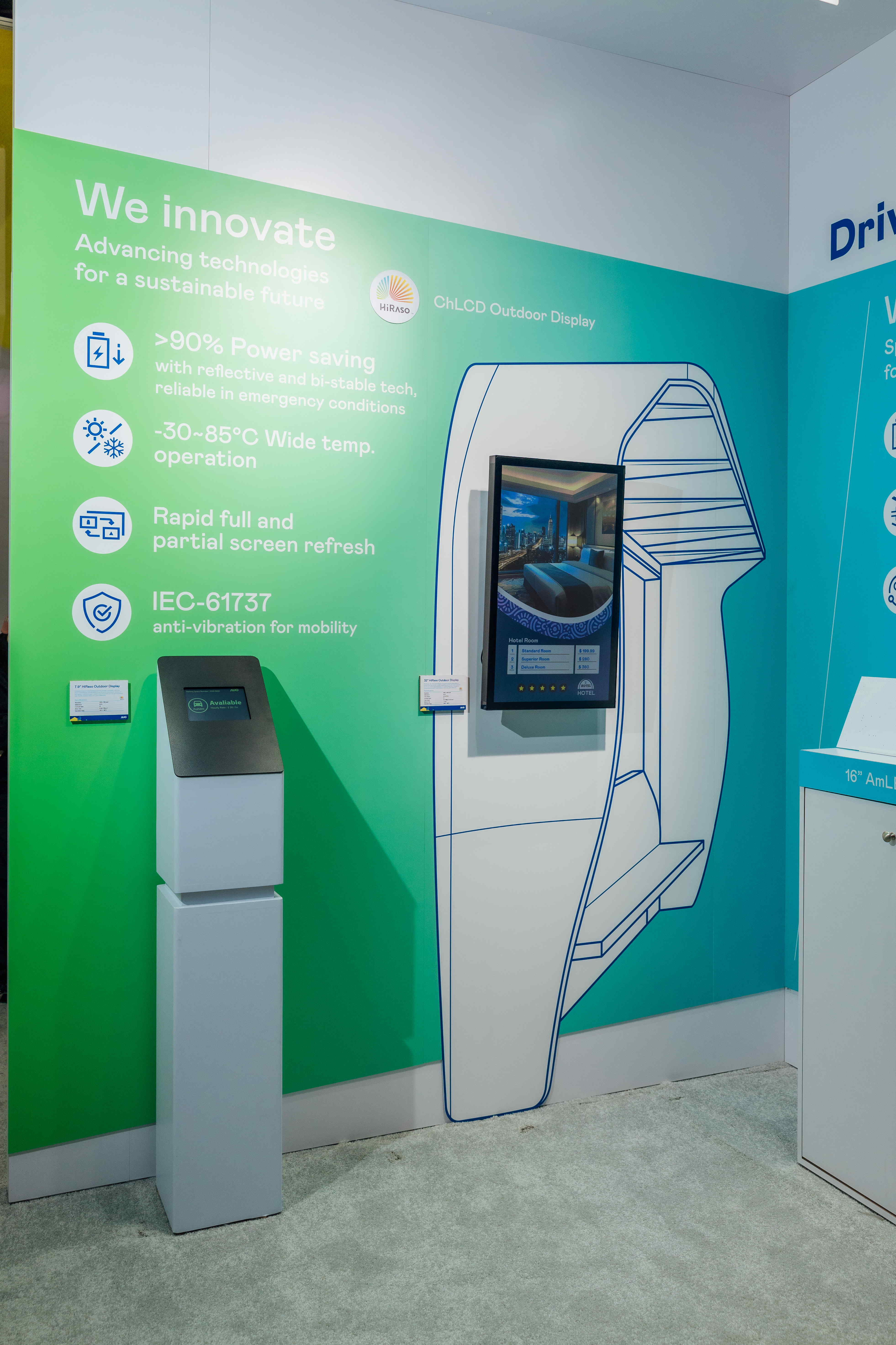 AUO utilizes innovative display technology HiRaso (Cholesteric Liquid Crystal Display, CHLCD with Bi-stable technology) to achieve zero energy consumption in their displays, expanding power-saving AmLED display technology to automotive products and applying post-consumer recycled (PCR) plastics and panels produced with 100 Perecent Green electricity to notebooks and monitors, thereby increasing green value.