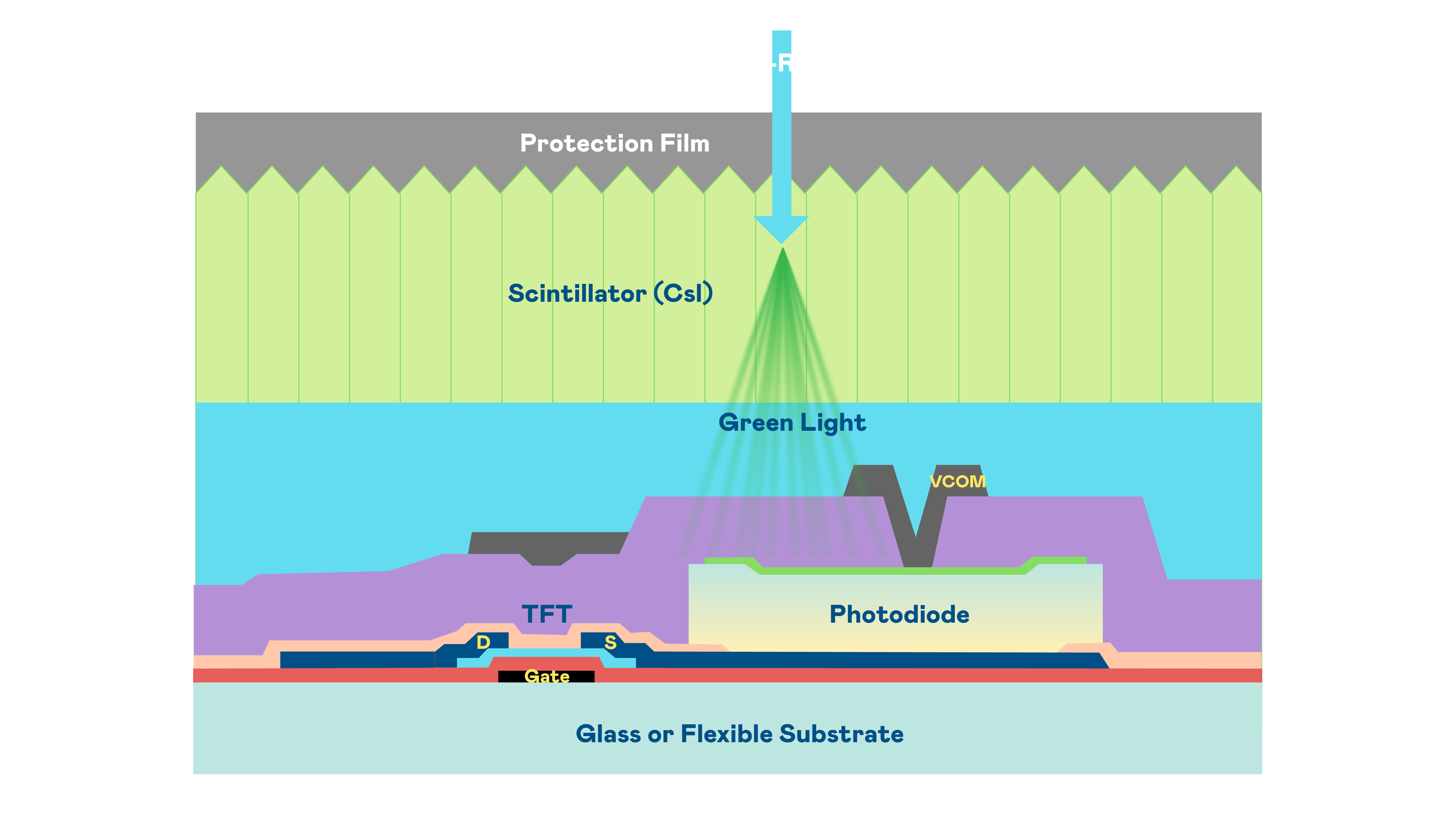 YY易游m6米乐的X光影像感测阵列使用薄膜电晶体 (TFT) 作为每个像素的读取开关,搭配光电二极体(Photodiode)的光电转换元件,用以感测X光影像讯号。